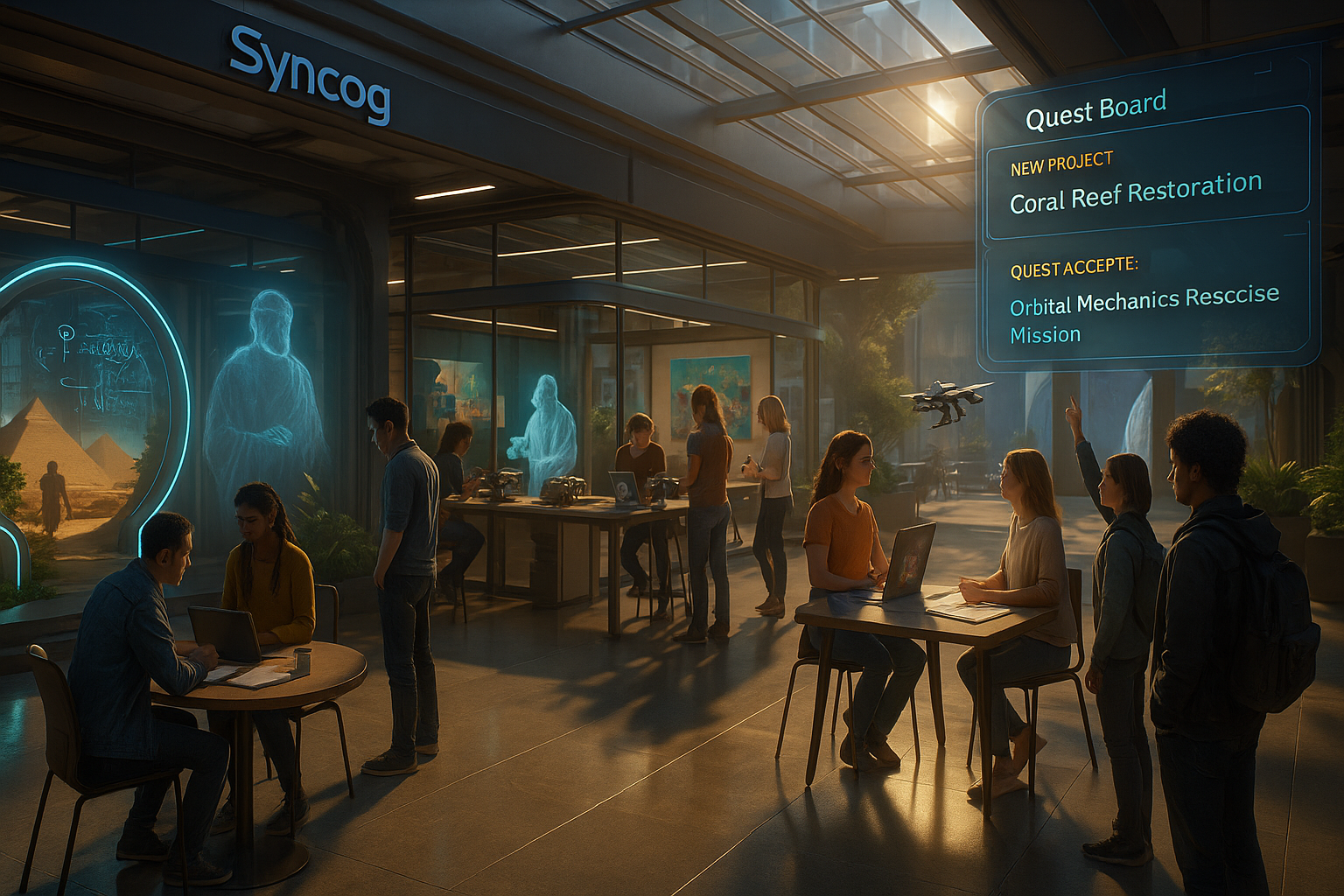 Syncog’s mission is to transform learning into lived experience, uniting immersive worlds, agentic AI mentors, and continuous verifiable student assessment, so every learner can build real skills, prove mastery, and thrive in study, work, and life — so verified skills, not seat time, become the global currency of opportunity